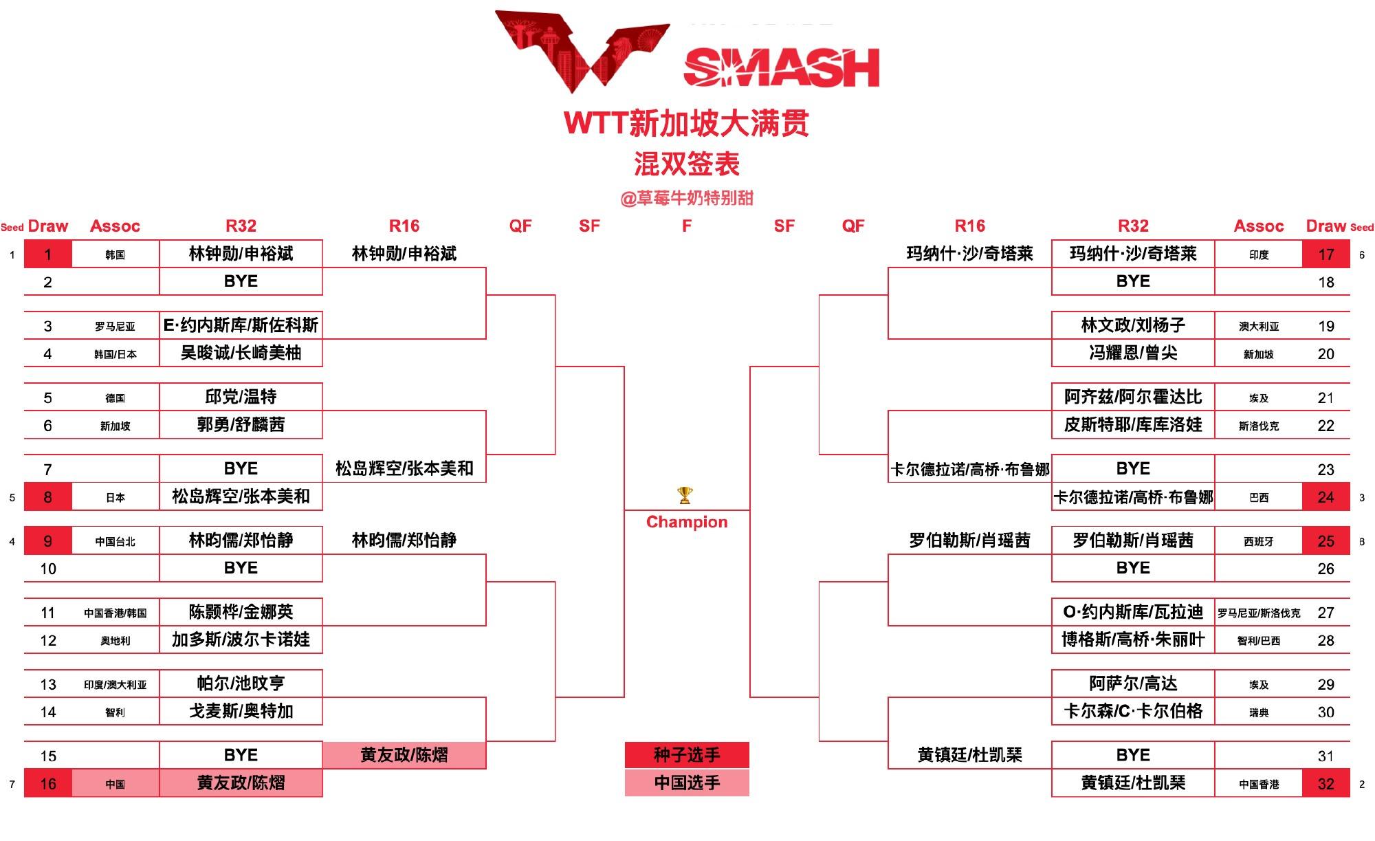 混雙項目國乒是派出黃友政/陳熠這對組合,他們首輪也是輪空,他們下一輪的對手是帕爾/池旼亨VS戈麥斯/奧特加的勝者。韓乒王牌組合林鐘勳/申裕斌、日乒王牌組合松島輝空/張本美和也都是首輪輪空。