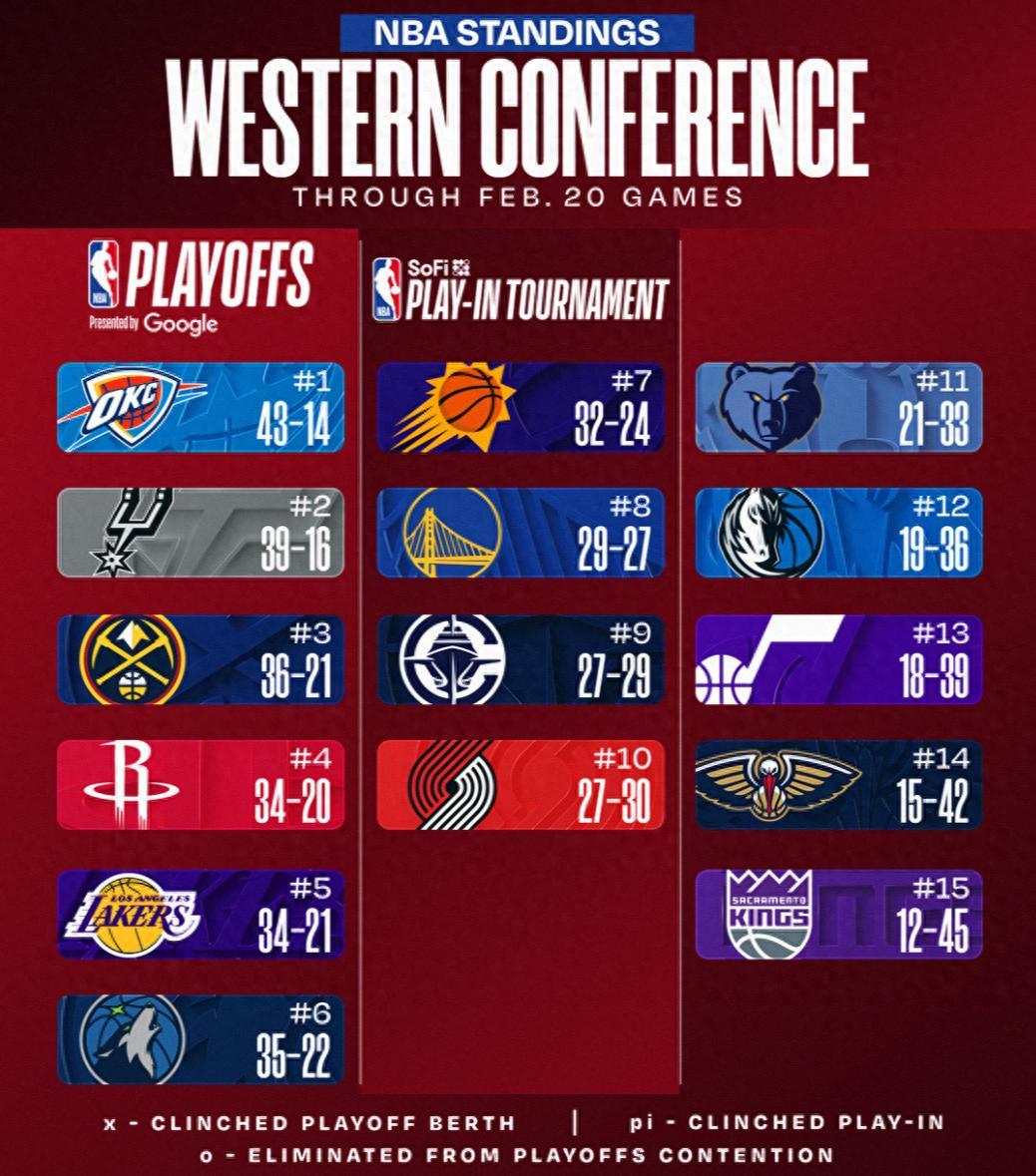 北京時間2月21日的常規賽打完後,西部的格局又發生了一些變化,雷霆大勝籃網但還是丟掉了聯盟第一,因爲勝率已經不如活塞;快船逆轉湖人失敗但開拓者慘敗掘金,快船還是穩住了西部第九的席位。湖人與森林狼沒有勝場差,湖人是艱難壓制森林狼。