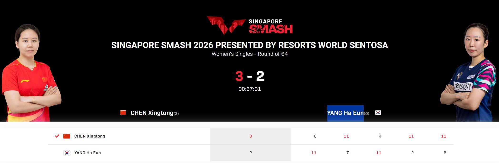 北京時間2月22日,WTT新加坡大滿貫女單1/32決賽,陳幸同3-2擊敗梁夏銀晉級,五局比分:【6-11,11-7,4-11,11-2,11-6】。這場比賽陳幸同是0-1、1-2落後,最終驚險以3-2逆轉。