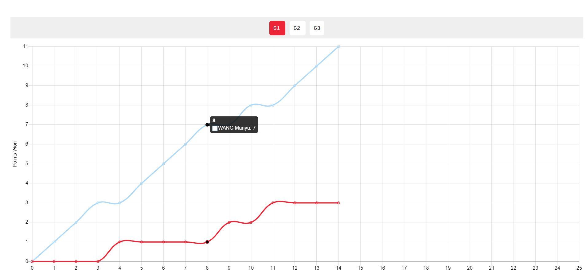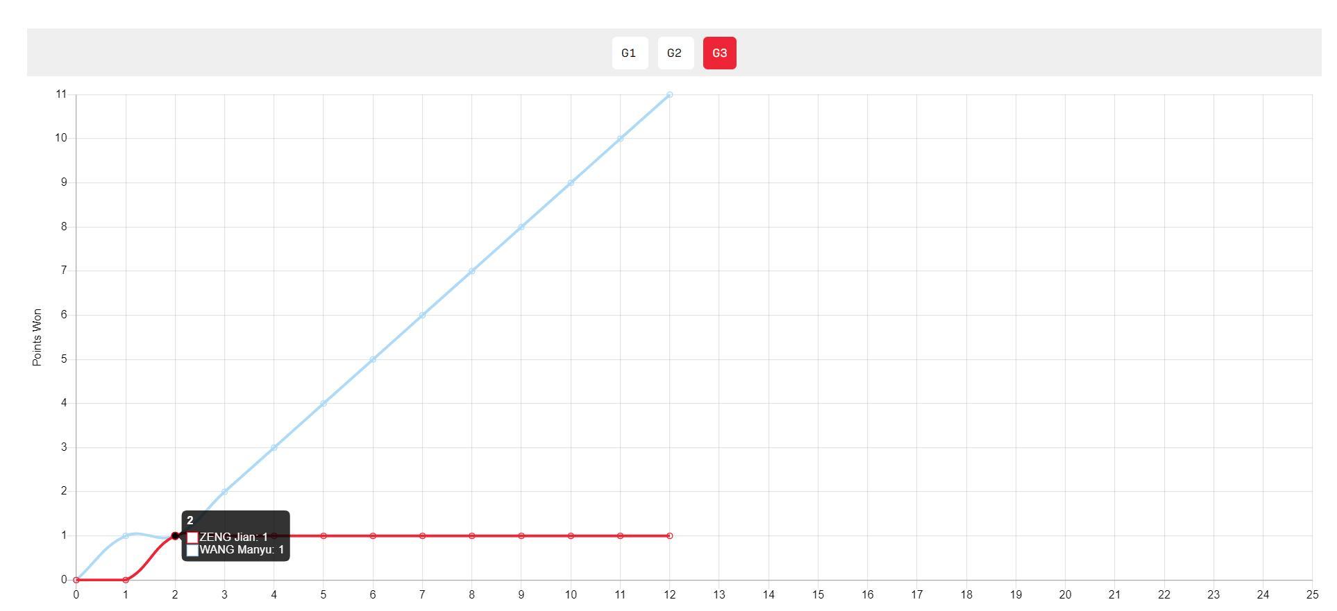 第三局開場兩人1-1平,隨後就是王曼昱的進攻表演,曾尖就連防守都做不到,王曼昱一波10-0鎖定勝局。