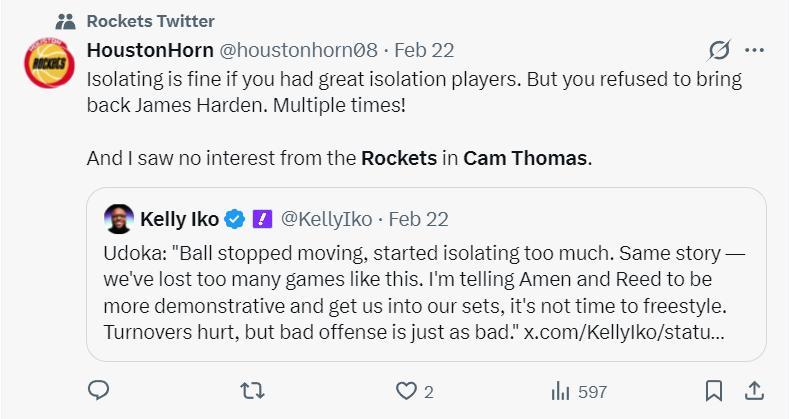 一天之前,火箭領先尼克斯18分被逆轉,尤其是末節15-33進攻端崩盤。休媒就炮轟過斯通的運作,對卡姆-托馬斯沒有興趣是敗筆。