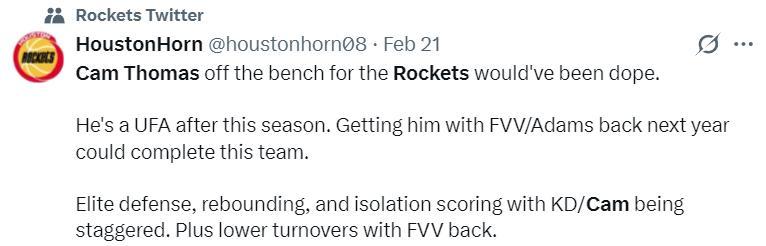此前休媒還表示:如果托馬斯能代表火箭替補登場那該有多棒啊,明年等到範弗利特、亞當斯迴歸這支火箭隊就是攻防一體的球隊。高效的防守、出色的籃板球,托馬斯/杜蘭特的單打能力,再加上範喬丹迴歸還能減少失誤。