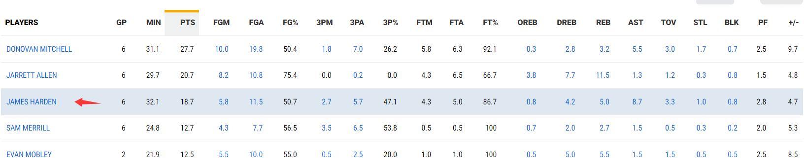 哈登加盟騎士隊的6場比賽,場均32.1分鐘,拿到18.7分8.7助攻5籃板1搶斷0.8蓋帽,命中率50.7%,三分命中率47.1%,罰球命中率86.7%,正負值+4.7。