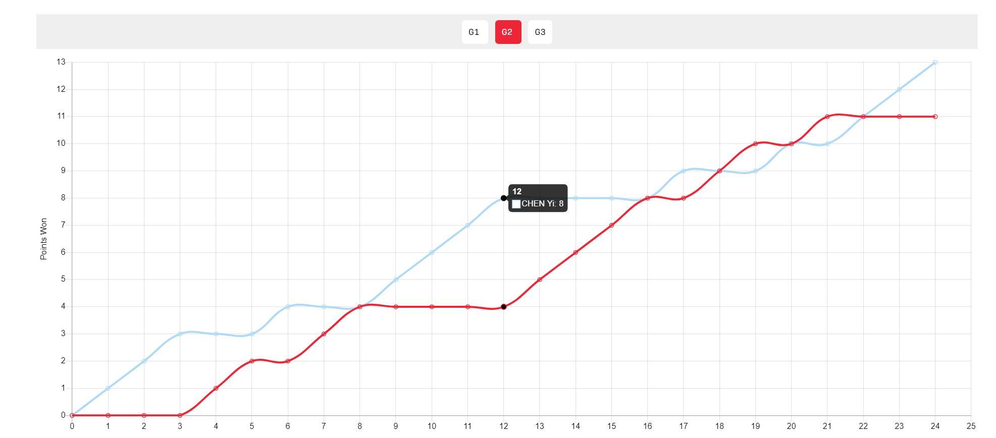 這場比賽的第二局就是本場比賽的轉折點,第二局陳熠一度8-4領先舒麟茜,但隨後陳熠的老毛病又犯了各種低級失誤送分,舒麟茜一波流追到8-8、9-9、10-10、11-11(舒麟茜還一度10-9局點、11-10局點),可這一次陳熠絲毫不慌,最終陳熠13-11拒絕逆轉拿下勝利。