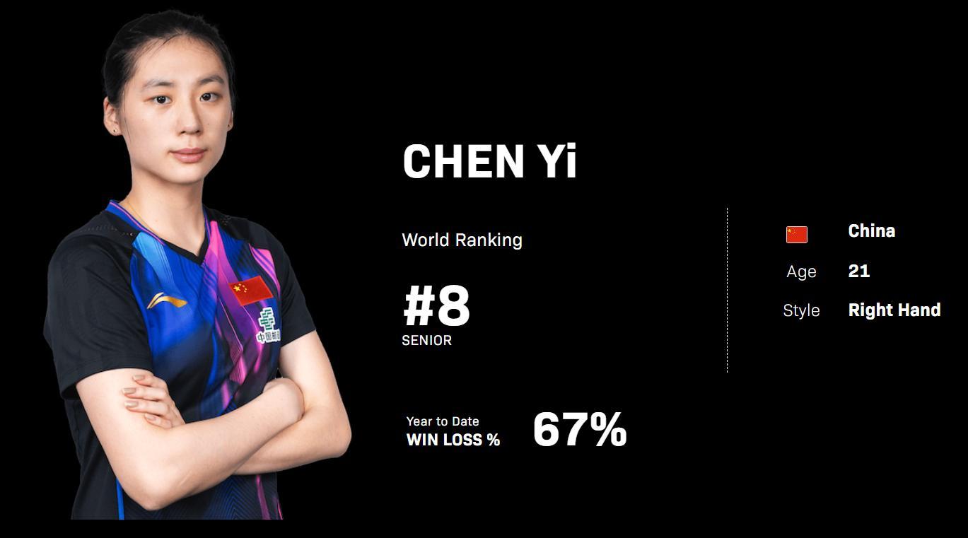 21歲的陳熠世界排名第八,她是洛奧週期的重點培養對象,本次她身兼三項,女雙搭檔蒯曼,混雙搭檔黃友政,希望她後續能一直強硬。