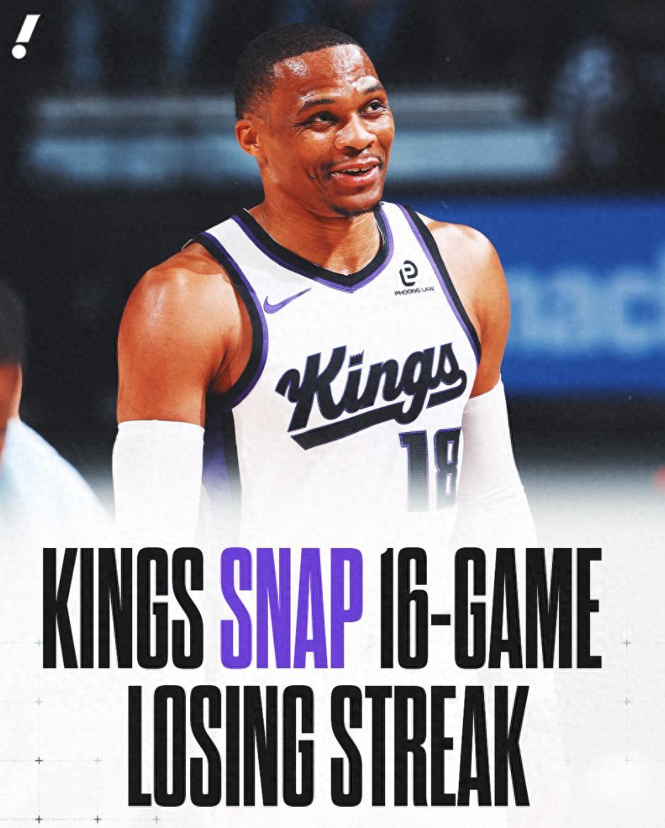 北京時間2月24日,國王以123-114擊敗灰熊結束16連敗。這場比賽國王在客場一直手握領先,這場勝利是1月16日後國王的首次勝利,也是自12月6日後首個客場勝利。此役威少拿到25分7助攻。