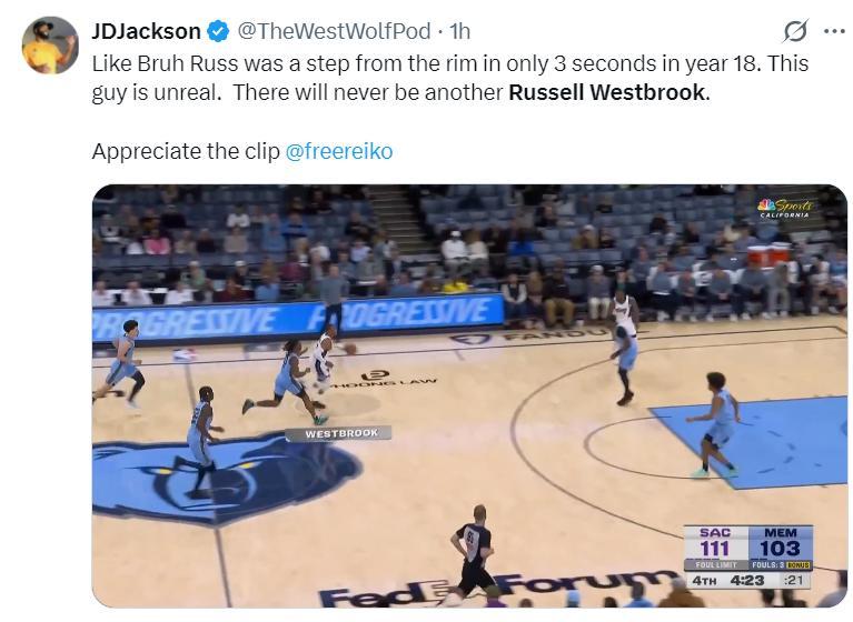 這場比賽美記JD-傑克遜盛讚威少,威少在職業生涯第18年還可以持球推進只花3秒就到對方籃筐附近,這傢伙太厲害了。再也不會出現像威少這樣的球員了。