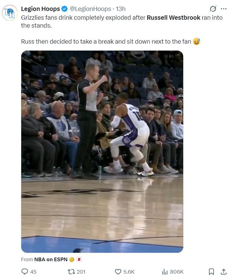 此役威少還有一個救球成爲全美熱議的話題,威少直接衝到了第一排的觀衆席,威少直接打翻了一杯飲料。