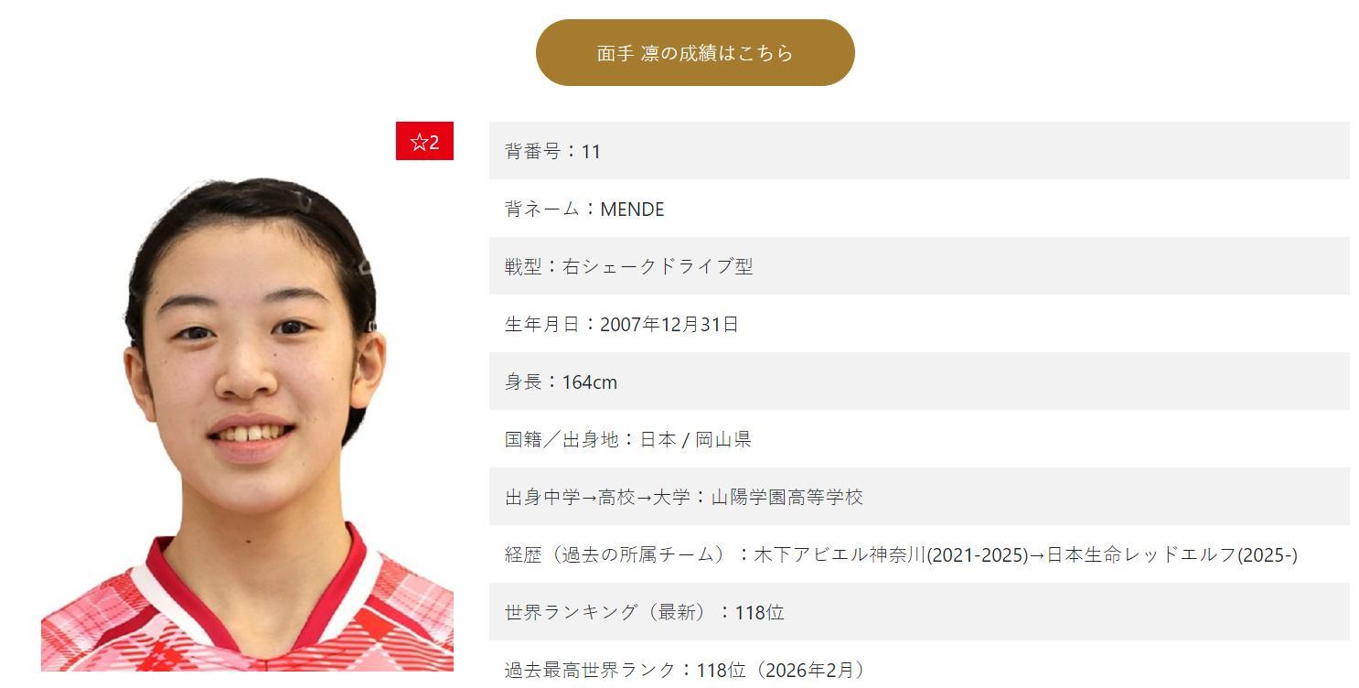 在此前結束了倫敦世乒賽日本隊內選拔賽中,面手凜半決賽3-1淘汰了長崎美柚,她更是在決賽中擊敗了高森愛央,18歲的面手凜拿到世乒賽選拔賽的冠軍,所以她拿到了一個世乒賽的名額。(長崎美柚是被女隊主教練中澤銳選入)