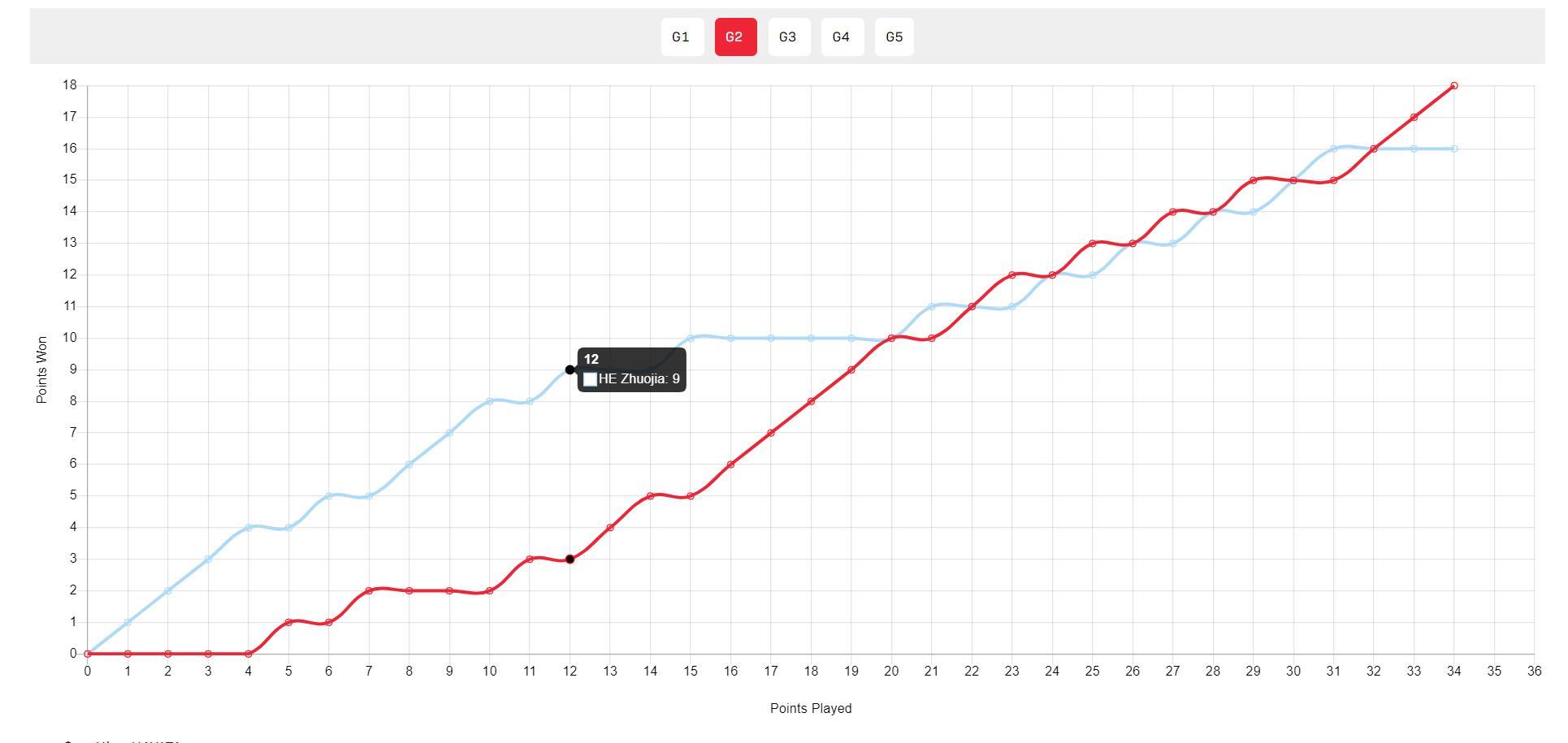 第二局開場何卓佳就一路領先,最多時9-2領先到7分,隨後一度10-5拿到局點,就差一點就連下兩局,如果第二局拿下勝利後何卓佳就能爆冷早田希娜了。可後來何卓佳的失誤明顯增多,早田連拿5分扳成10-10,11-11、12-12、13-13、14-14、15-15、16-16,最終關鍵分早田逆轉成功18-16。