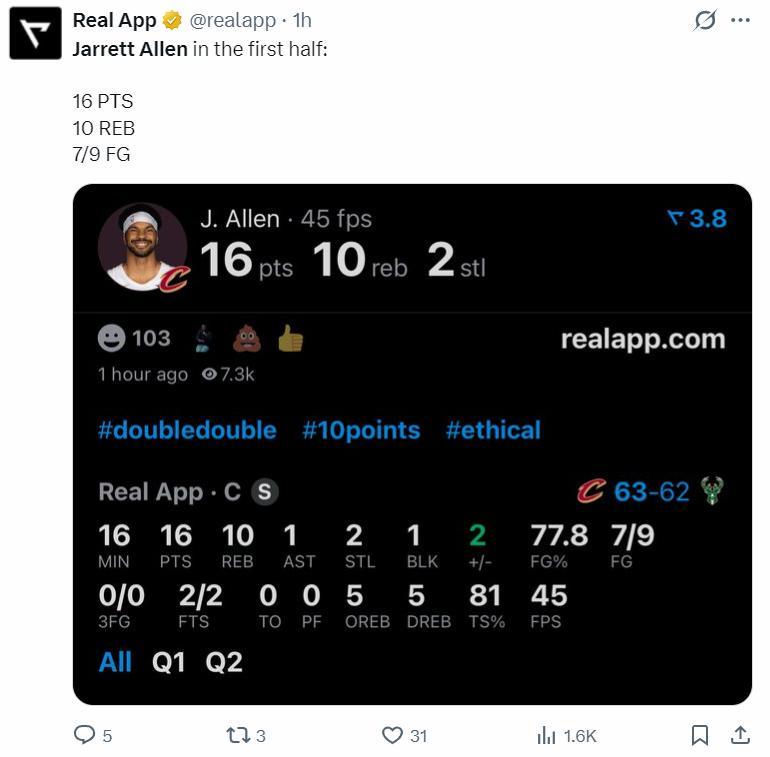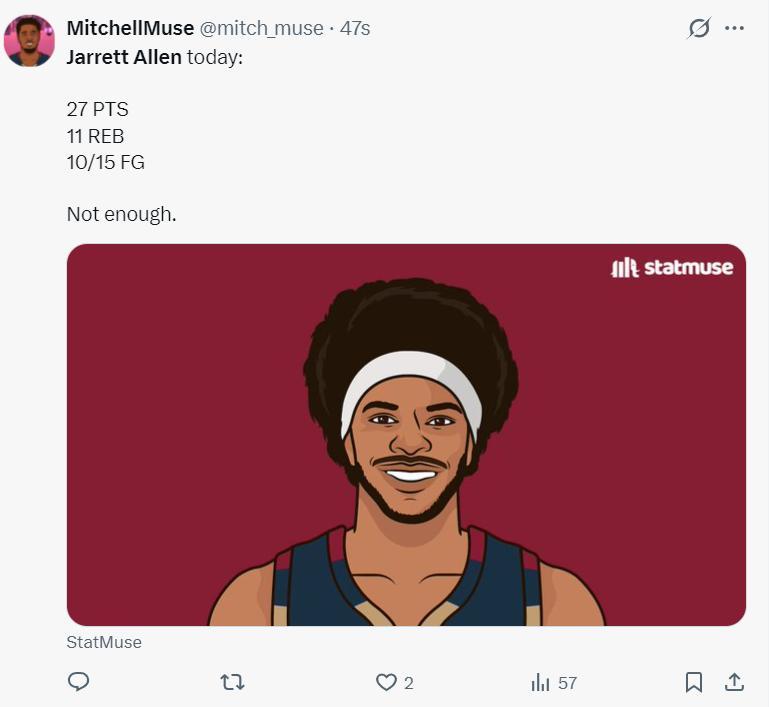 這導致整個下半場阿倫只有1個籃板球進賬,全場比賽32分鐘,15中10,罰球8中7,拿到27分11籃板1助攻2搶斷1蓋帽,命中率66.7%,真實命中率72.9%,正負值-10。雖然沒有騎士三巨頭阿倫依舊拿到了爆炸的兩雙數據。