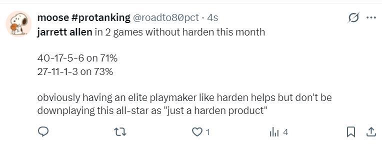 有數據媒體寫道,二月份阿倫在沒有哈登的情況下打了兩場比賽,一場40分17籃板5助攻2搶斷4蓋帽,真實命中率71%;一場27分11籃板1助攻2搶斷1蓋帽,真實命中率73%,這兩場比賽合計拿到67分28籃板,顯然擁有哈登這樣的組織核心對阿倫有所幫助,但不要將阿倫這位全明星內線貶低爲“僅僅是哈登幫助的產物”。