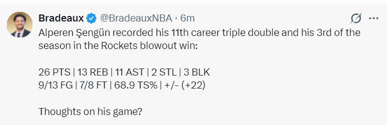 第三節申京僅打8分鐘後他已經完成了三雙數據,這時候火箭也領先國王達到30+,申京12投8中斬獲24分12籃板10助攻2搶斷2蓋帽的頂級三雙數據。