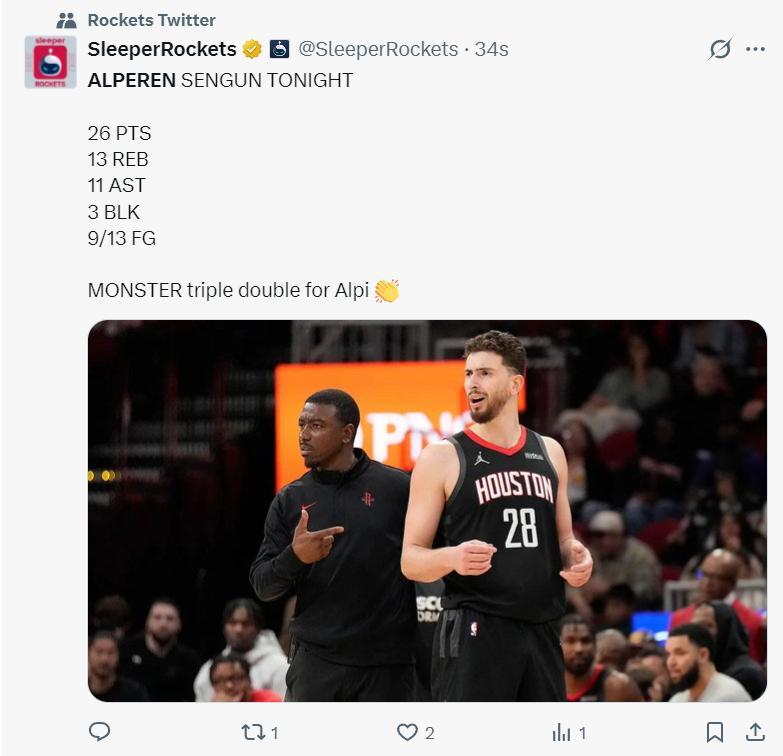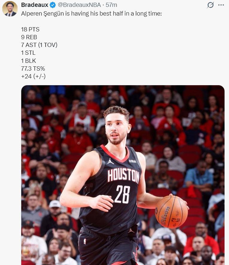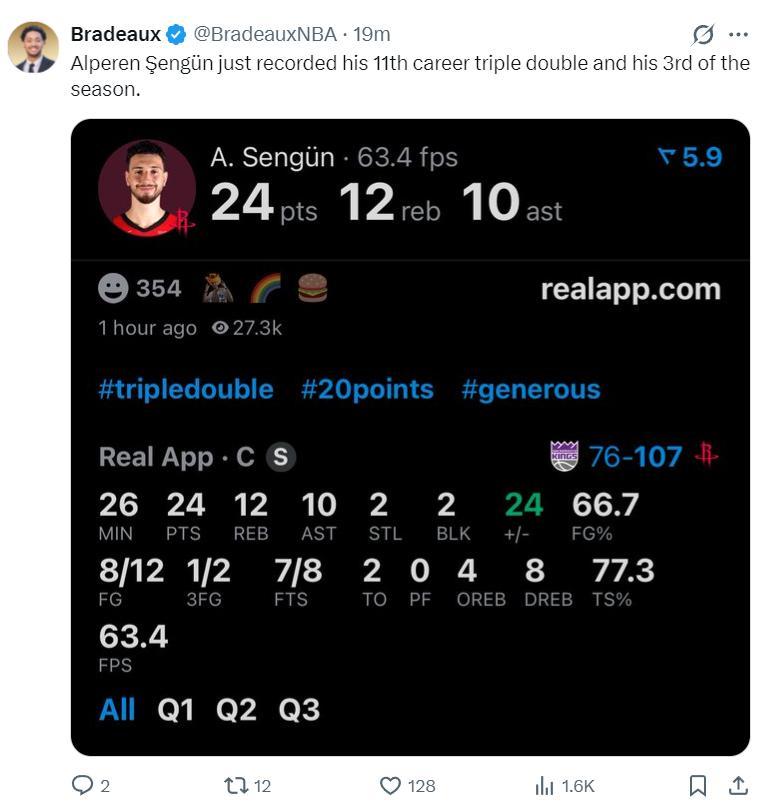此役阿爾佩倫-申京表現非常出色,首節9分鐘裏他就已經3中3拿到6分4籃板4助攻,次節9分鐘裏更是6中3+三分1中1拿到12分5籃板3助攻,半場18分9籃板7助攻1搶斷1蓋帽1失誤,真實命中率77.3%,正負值+24。國王的內線羣根本無法限制他分毫。