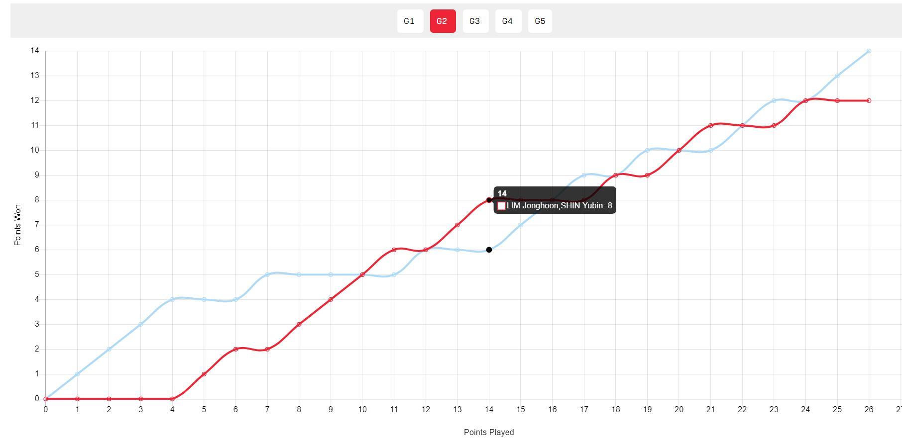 這場比賽林鐘勳/申裕斌一開始是大比分1-0領先,隨後連丟兩局1-2落後,但這兩人並沒有放棄最終連下兩局完成大逆轉。