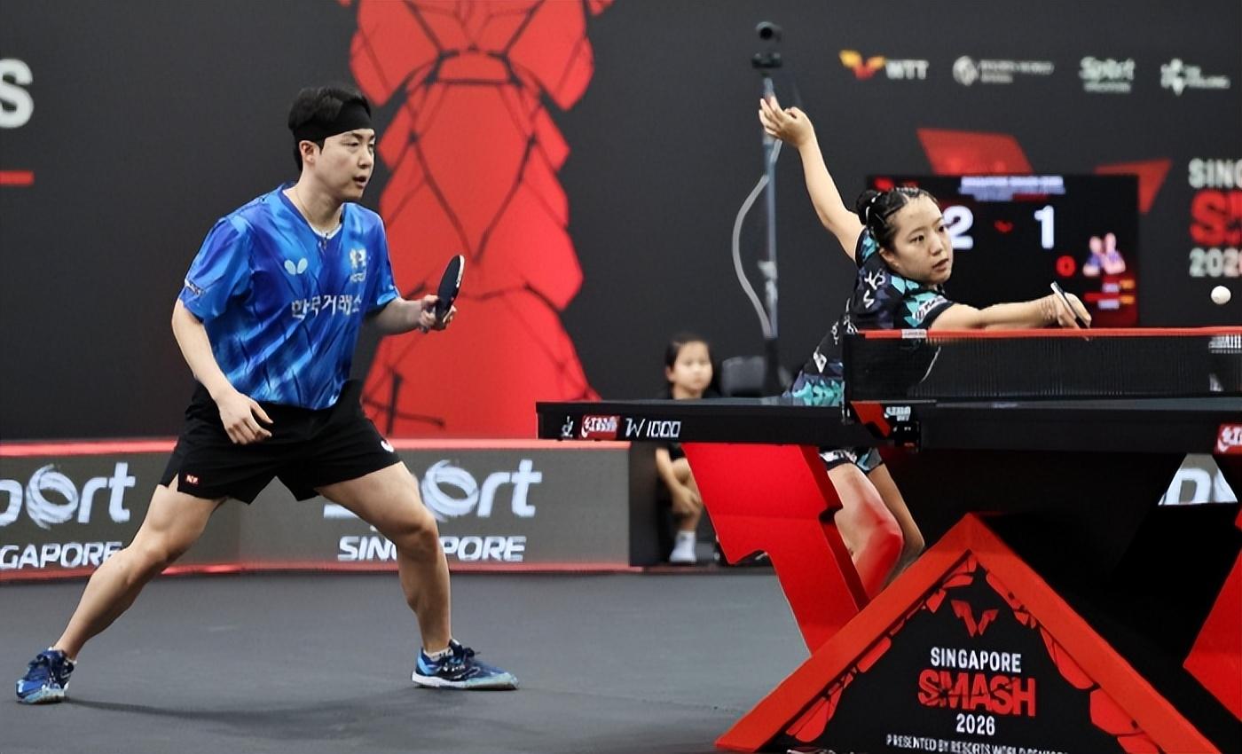 北京時間2月26日,WTT新加坡大滿貫混雙半決賽,韓乒組合林鐘勳/申裕斌3-2擊敗跨協會組合陳顥樺/金娜英晉級決賽,五局比分:【11-9,12-14,12-14,11-6,11-6】。