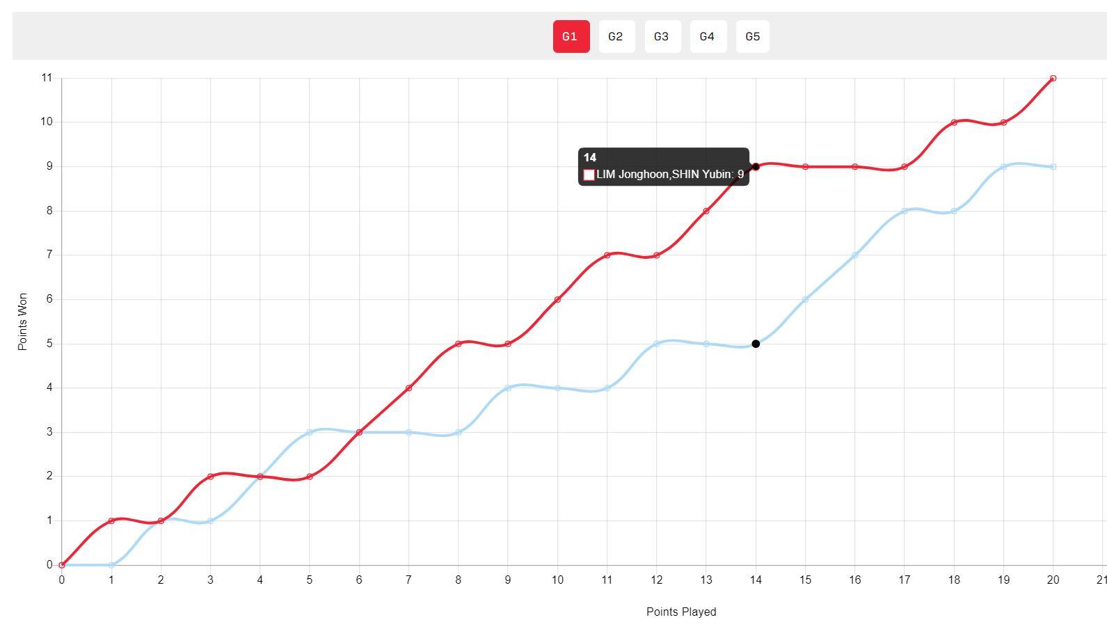 第一局雖然林鐘勳/申裕斌是11-9贏球但開場這兩人一直掌控着節奏,一度是9-5領先,陳顥樺/金娜英連續得分追到8-9,關鍵分還是林鐘勳/申裕斌更勝一籌。