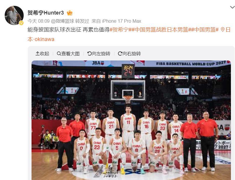 北京時間2月27日晨,中國男籃後衛賀希寧在社媒上發聲:能身披國家隊球衣出征,再累也值得。(賀希寧這樣的言論讓無數的中國球迷爲之動容)