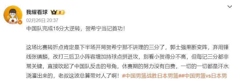 大V認爲這場比賽中國隊能完成15分逆轉賀希寧當記首功,下半場開局賀希寧不講理的三分讓郭士強改變陣容直接棄用了鋒線的張鎮麟改打三後衛。