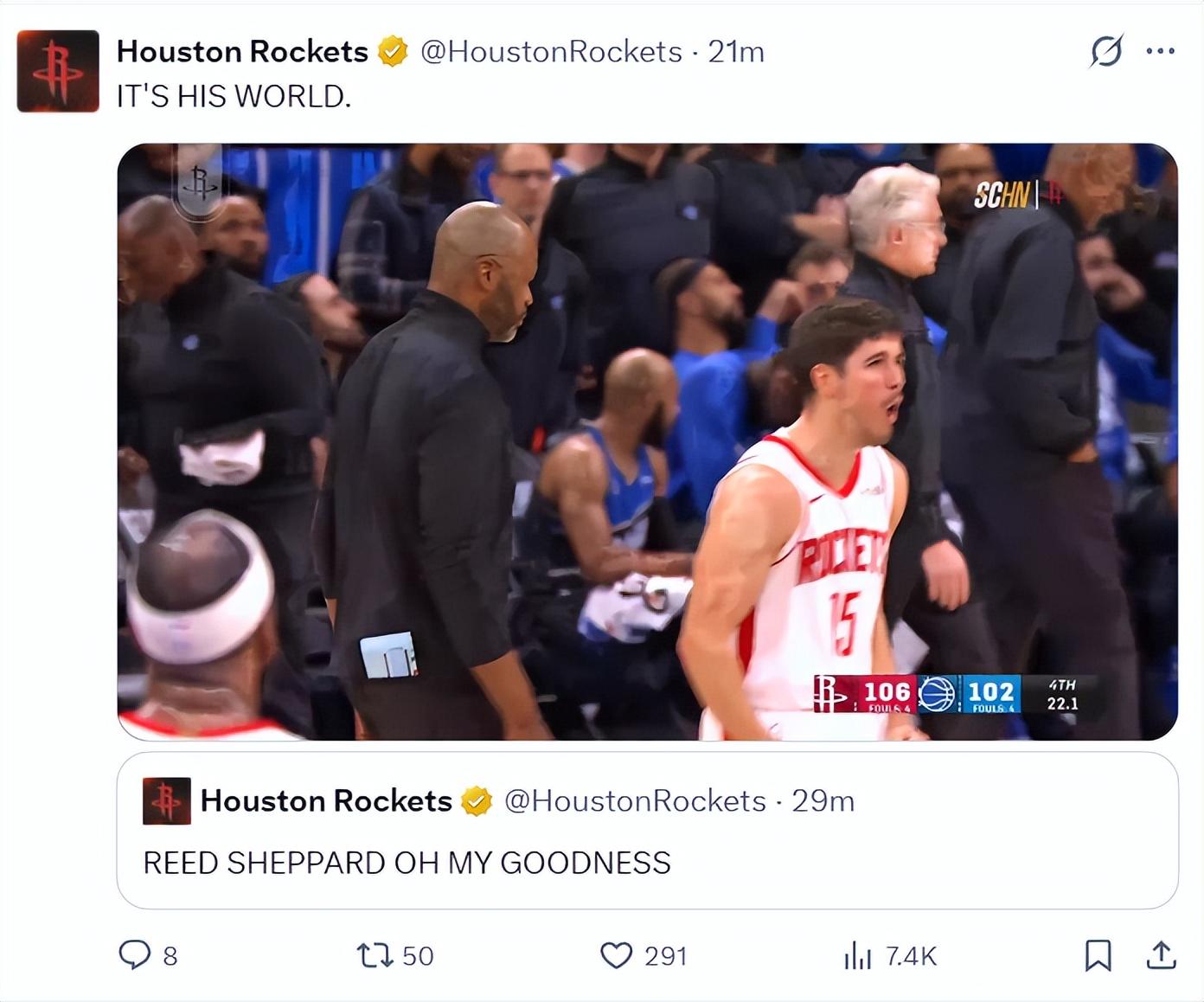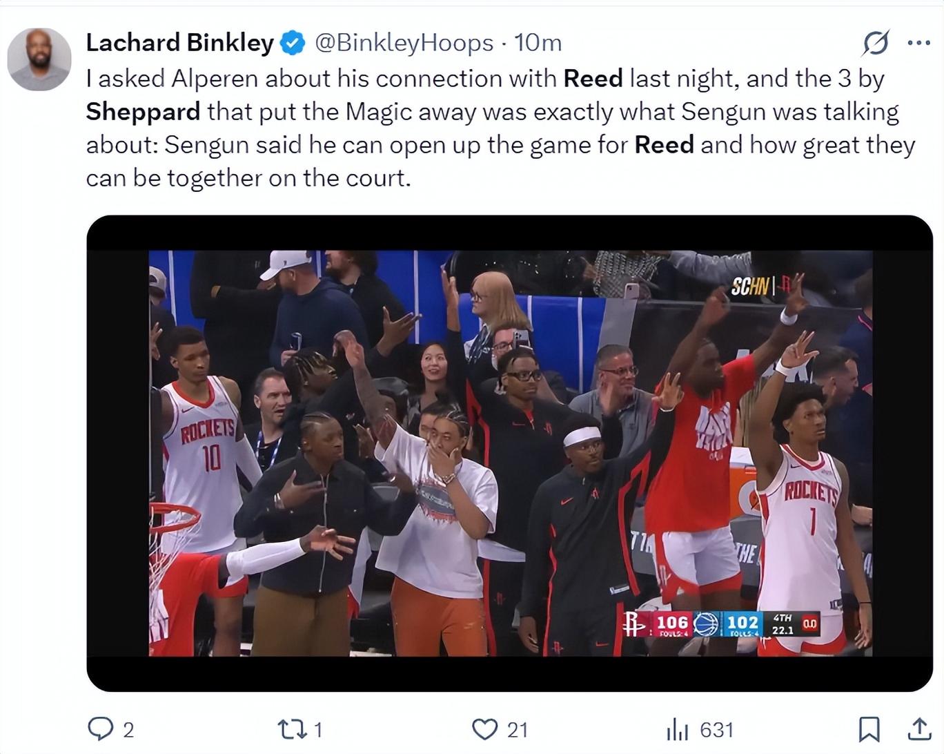 火箭記者蘭德里-賓克利賽後寫道:我昨晚跟申京聊天,申京認爲謝潑德有在比賽時刻打破僵局的能力,而且申京覺得他搭檔謝潑德時球隊發揮更出色。