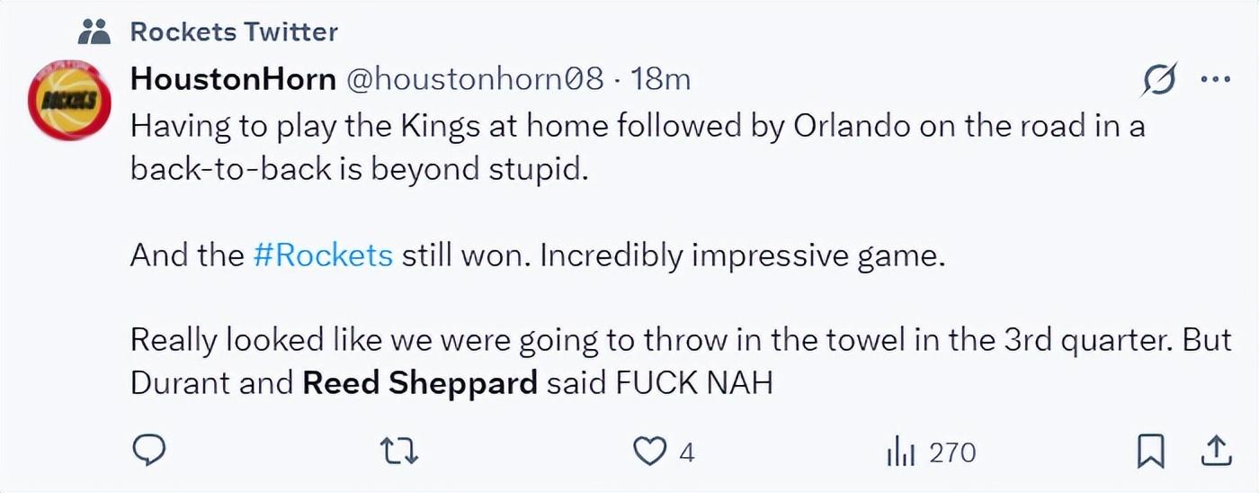 休媒:先是幫助火箭擊敗國王,隨後又客場挑落魔術,NBA的賽程設置的很不合理,但火箭還是贏球了,第三節我們就要放棄時,杜蘭特、謝潑德挺身而出說NO。