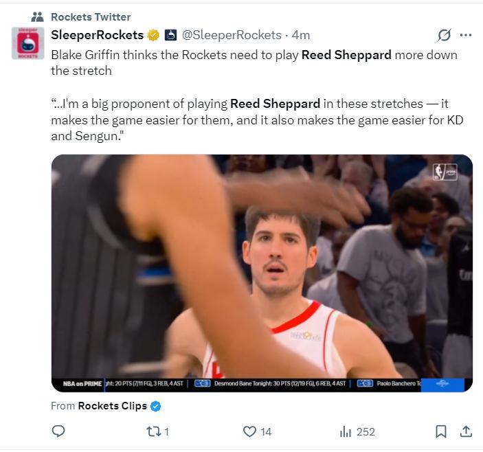 格里芬在直播間談到謝潑德:火箭隊應該在比賽的決勝時刻讓謝潑德多登場,火箭隊的進攻有申京、杜蘭特、謝潑德時明顯最出色。