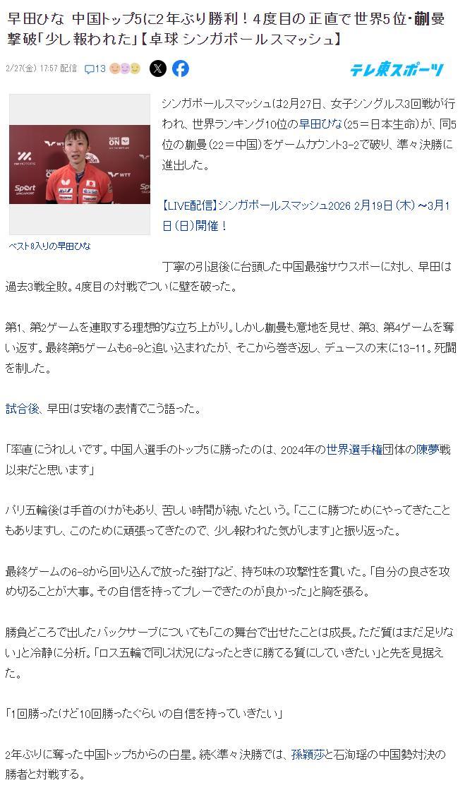 賽後日本媒體《東京乒乓球新聞》發文:早田時隔兩年再次戰勝中國世界排名前五的選手,她在決勝局大比分落後的情況下逆轉世界第五蒯曼,努力終於有了回報。