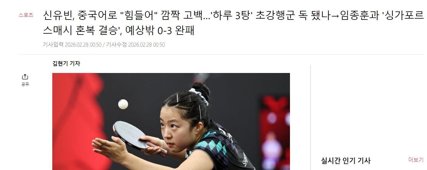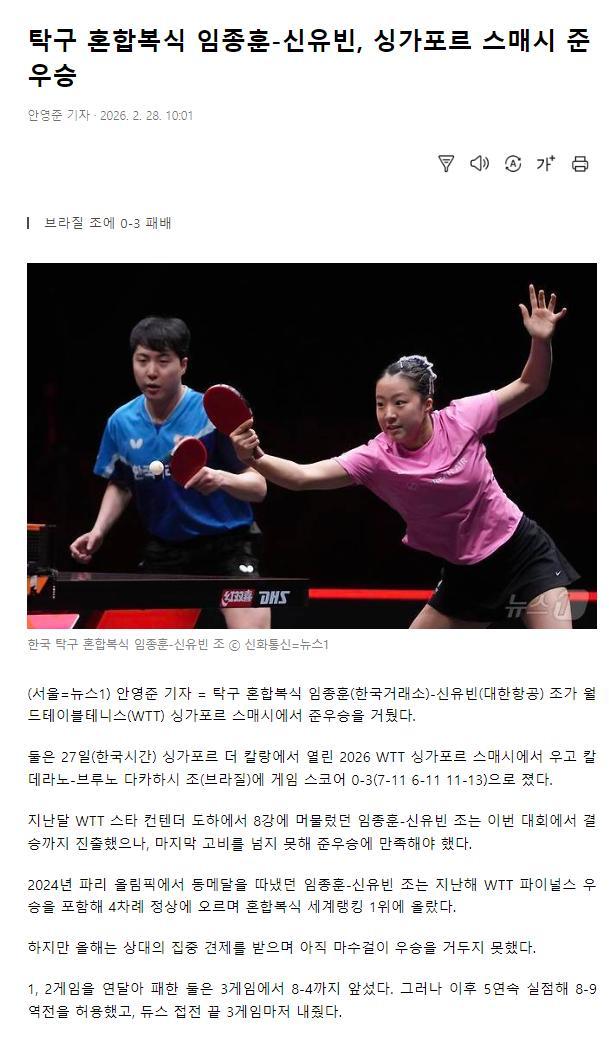 賽後韓媒發聲,世界第一的混雙組合申裕斌/林鐘勳在新加坡大滿貫獲得亞軍,在上個月的WTT多哈球星挑戰賽林鐘勳/申裕斌止步八強,這一次雖然進入決賽圈但未能越過最後一關只能屈居亞軍。