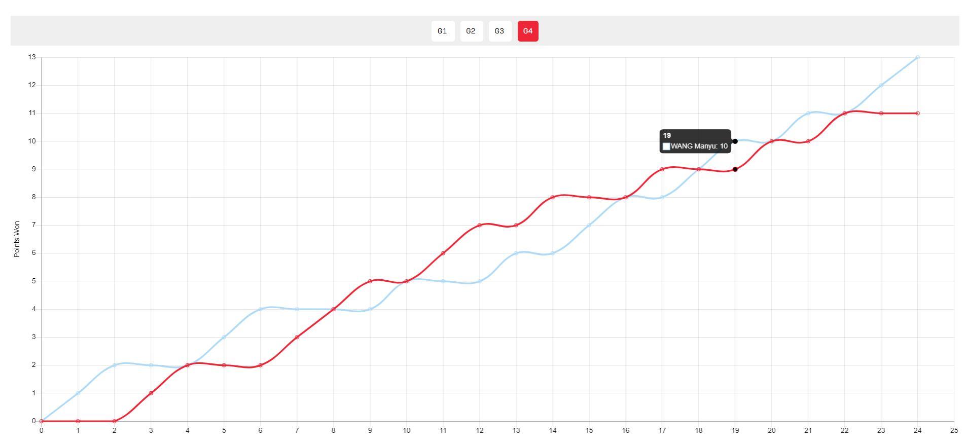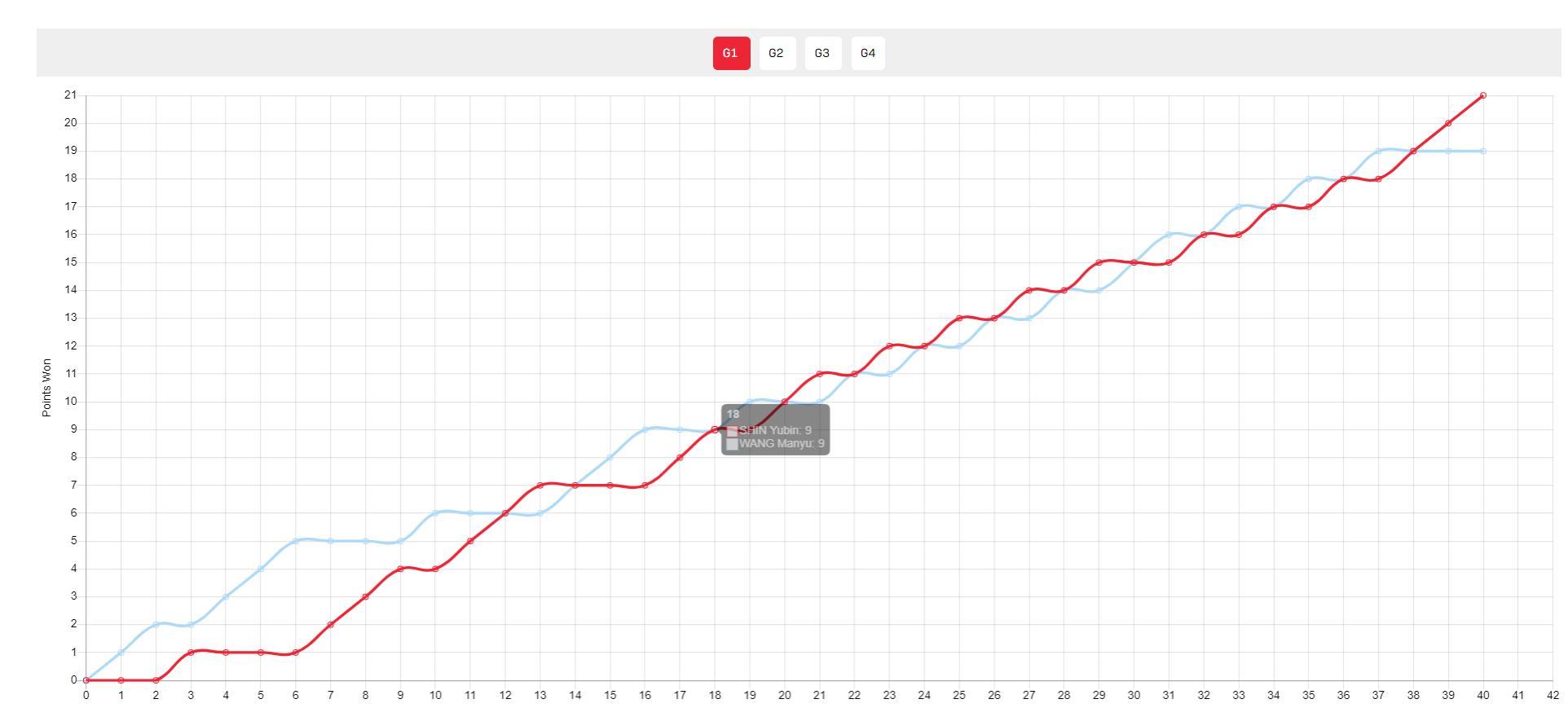 第一局開場王曼昱5-1領先,但申裕斌並沒有放棄追到6-6平,隨後兩人9-9、10-10、11-11就這樣鏖戰到19-19,最終申裕斌拿到關鍵分,這一局後申裕斌本該更自信,可王曼昱被激發出潛能。
