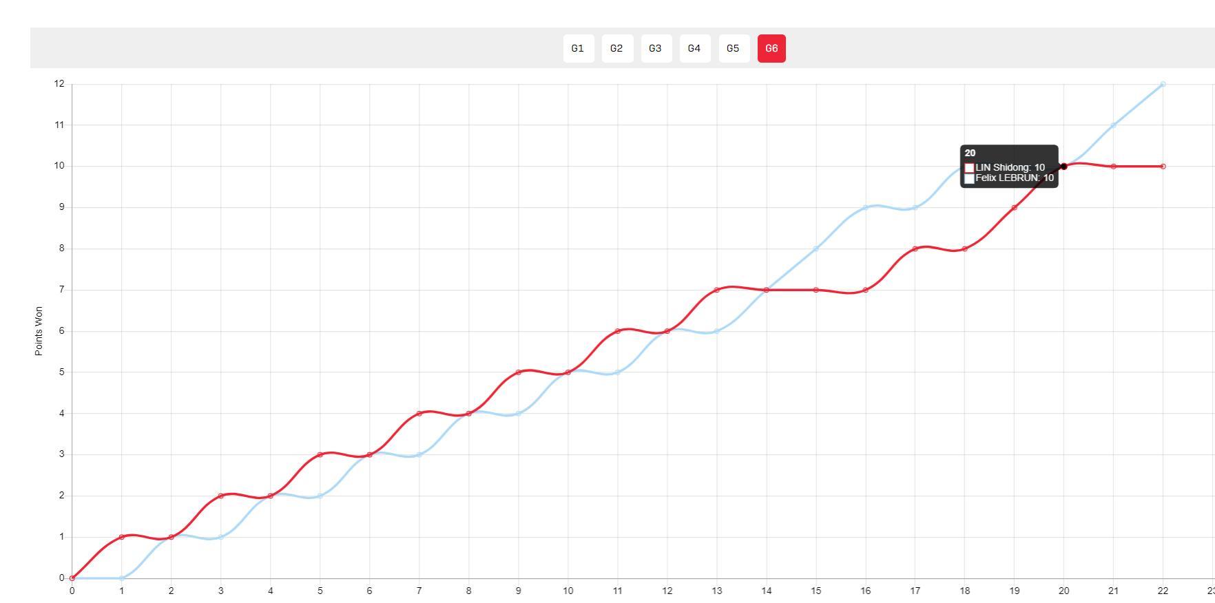 第六局開場1-1、2-2、3-3、4-4、5-5、6-6、7-7,小勒10-8賽點,林詩棟挽救兩個賽點,最終林詩棟還是10-12輸掉比賽。