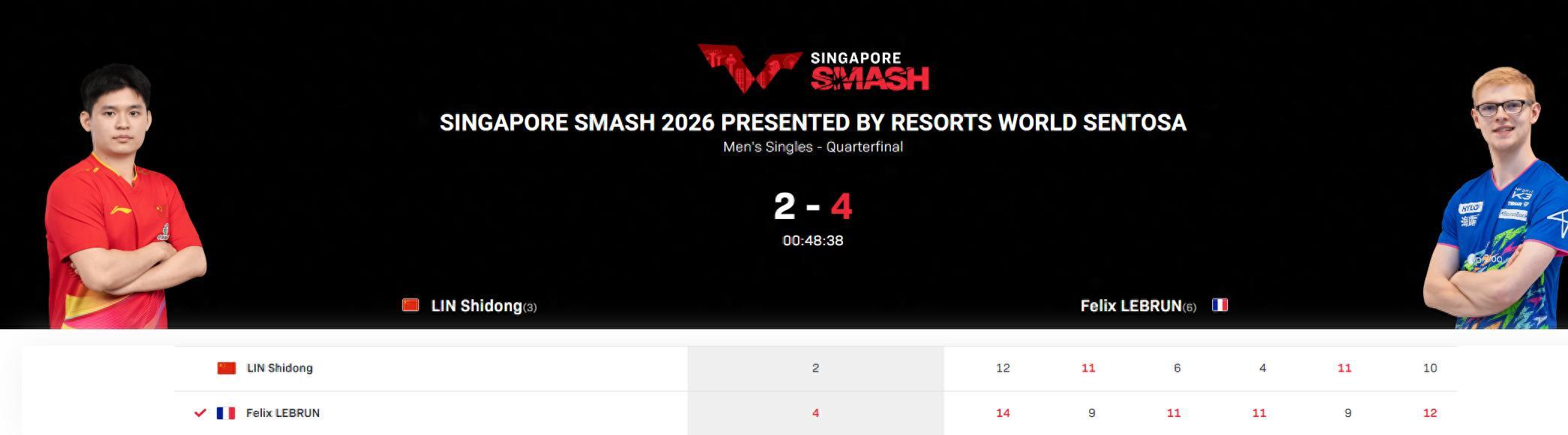 北京時間2月28日,WTT新加坡大滿貫男單1/4決賽,法國選手費利克斯-勒布倫4-2擊敗林詩棟晉級四強,六局比分:【14-12,9-11,11-6,11-4,9-11,12-10】。19歲的小勒世界排名第六,20歲的林詩棟世界排名第三,可此役世界第三被世界第六按在地板上摩擦。