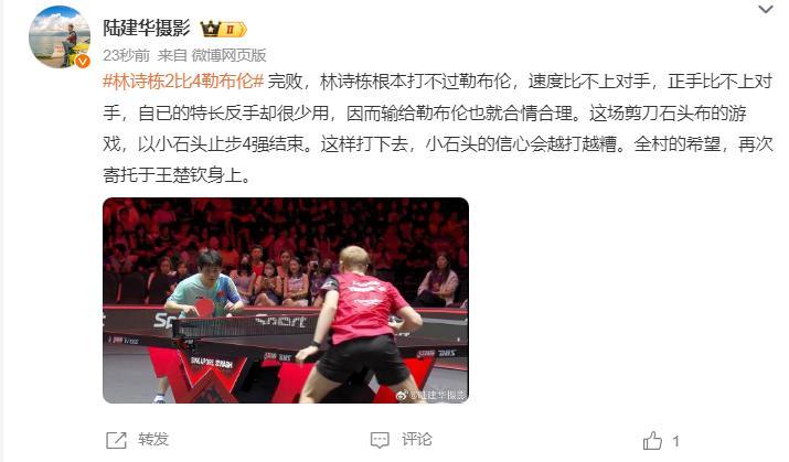 陸建華老師在賽後寫道:林詩棟完敗,他根本打不過小勒,速度比不上,正手也比不上,自己的特長反手卻很少用,所以他慘敗小勒合情合理。小石頭信心越打越遭,信心已經沒有了。