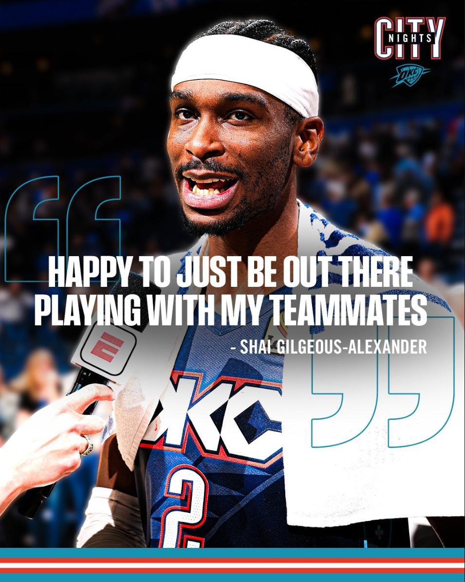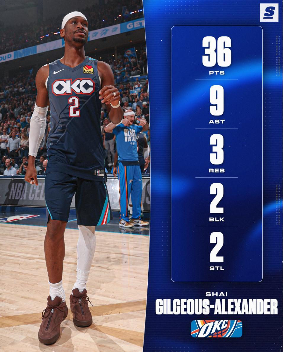 全場比賽33分46秒,亞歷山大29中12,三分3中0,罰球13中12,拿到36分9助攻3籃板2搶斷2蓋帽,命中率41.4%,真實命中率51.8%,正負值+16。亞歷山大完完全全的躺贏一場,第四節不是卡魯索兩個三分早已輸球,加時賽關鍵1斷1上籃幫助球隊拿下勝利。