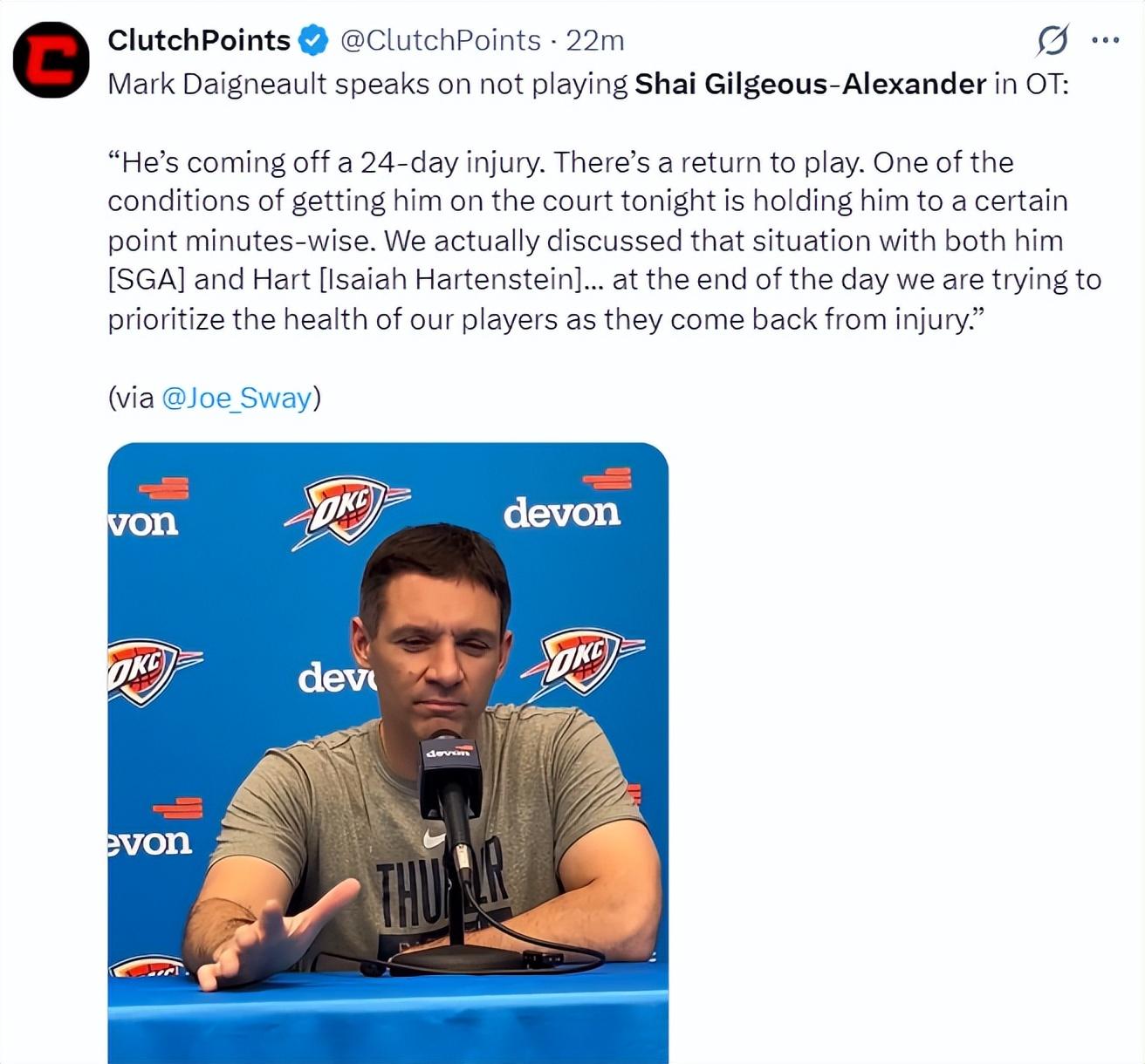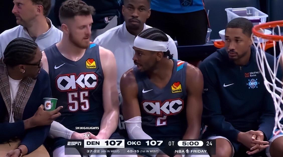 加時賽開打,亞歷山大、哈爾滕施泰因兩人都在場下休息,整個加時賽SGA一分鐘沒打,最關鍵的一波攻防是終場前1分22秒,又是卡魯索他搶斷了小哈的傳球后上籃命中,這一球后雷霆領先到5分。