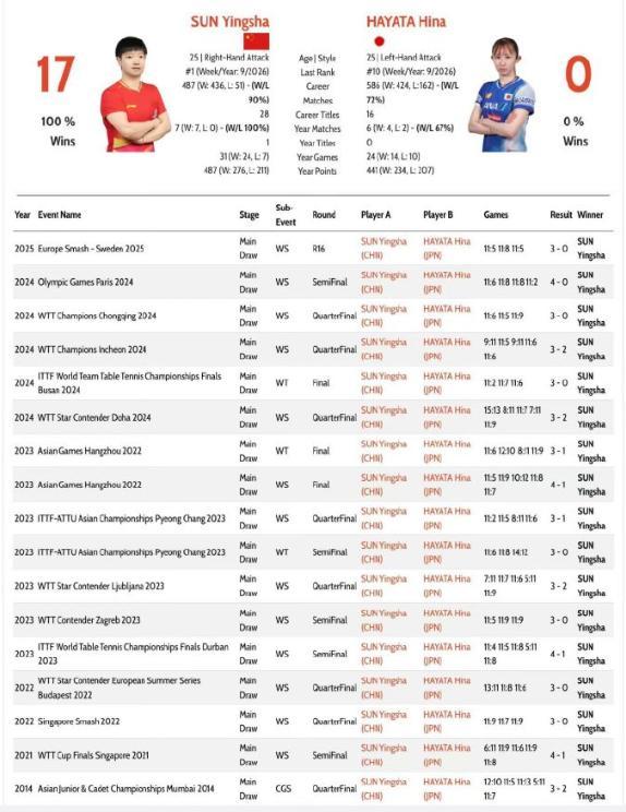 在這場比賽之前兩人的交手記錄是孫穎莎17戰全勝,而且最近的三次交手都是孫穎莎零封早田希娜,不得不說孫穎莎就是早田希娜的夢魘,雖然早田希娜爆冷了蒯曼,可蒯曼與健康孫穎莎的差距還是挺明顯的。