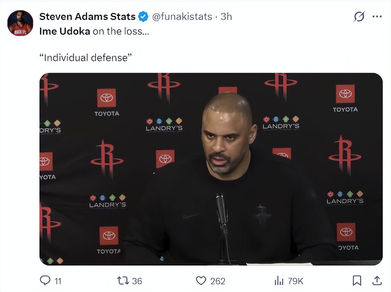 烏度卡賽後談到球隊輸球的關鍵,他認爲並不是熱火的聯防導致球隊失利,因爲火箭這個賽季見過不少聯防也應對的不錯,問題是出現空位後我們能投進那些球,但出現空位時投不進聯防就顯得更有效。對於我們來說得分其實不是問題,我覺得個人防守太差,雖然半場我們追平比分,可我們一節就丟30+,如果我們的個人防守能更正常一點,這場比賽就能贏了。