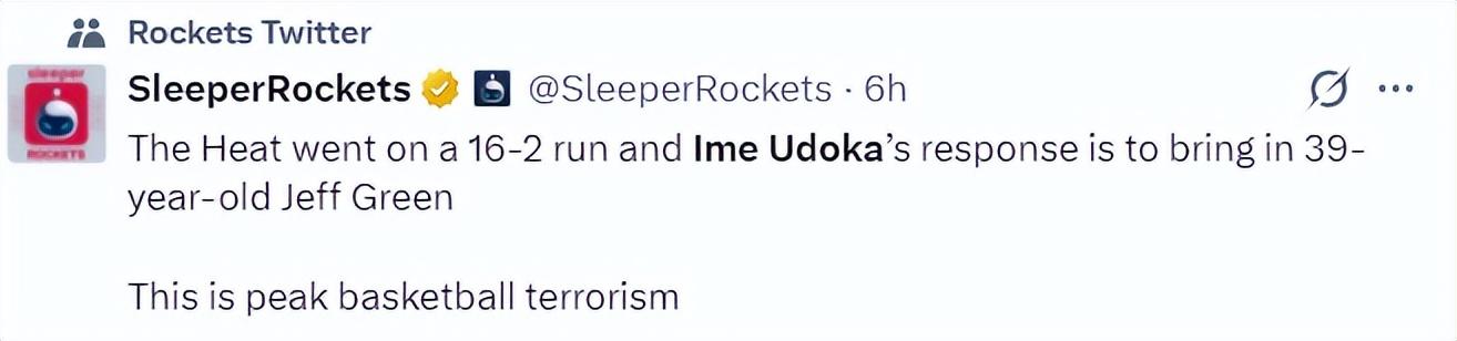 休媒也指責烏度卡,在熱火打出那一波16-2的攻防浪潮後,烏度卡沒有任何的調整,他只將39歲的傑夫-格林給換上。這簡直就是恐怖主義的籃球巔峯。