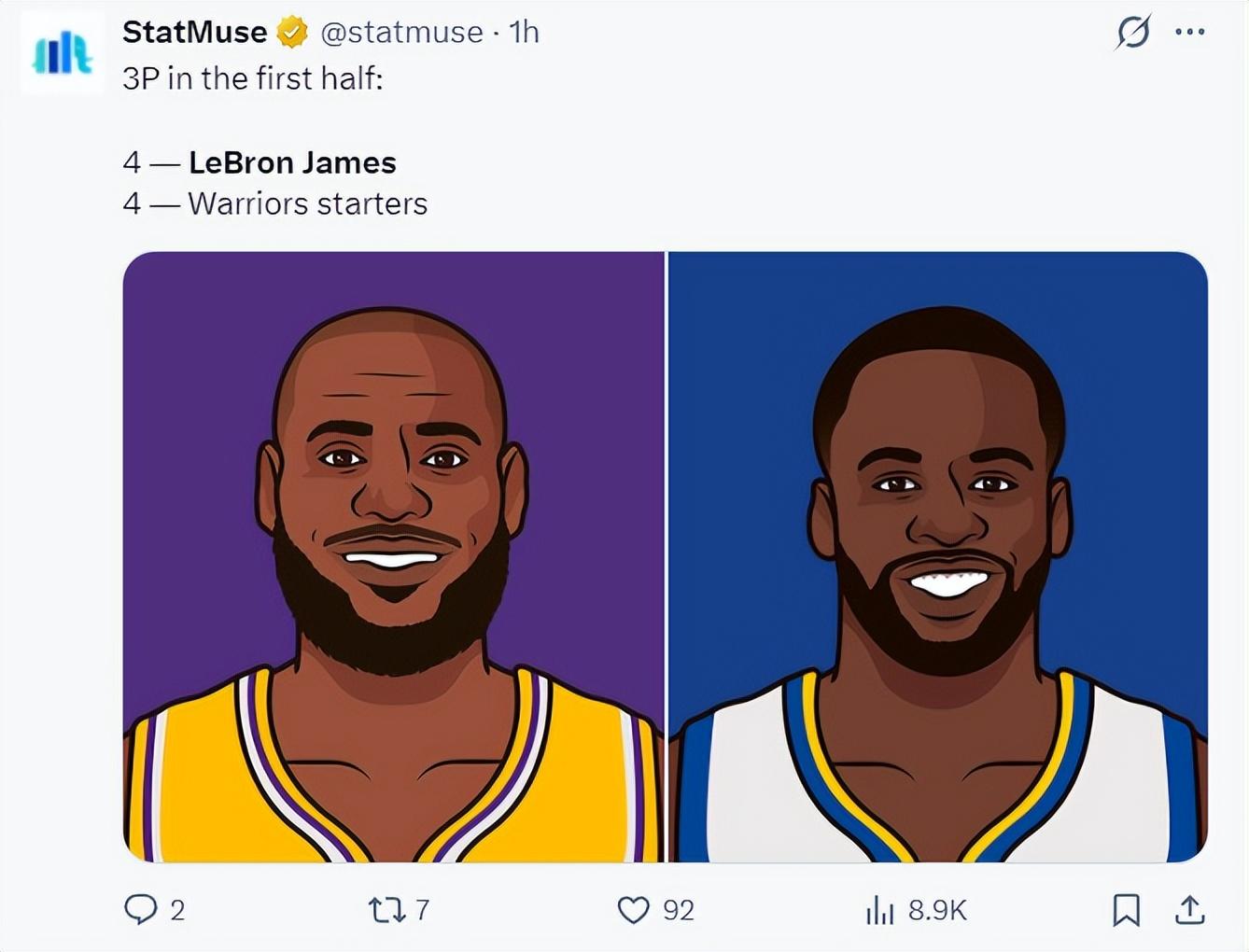 整個上半場湖人能大比分領先勇士,詹姆斯肯定是第一功勞,上半場詹姆斯17分鐘,10中7,三分4中4,拿到20分4籃板4助攻1搶斷,命中率70%,三分命中率100%,真實命中率88.3%,他一人命中4個三分,勇士先發5人合計4個三分。