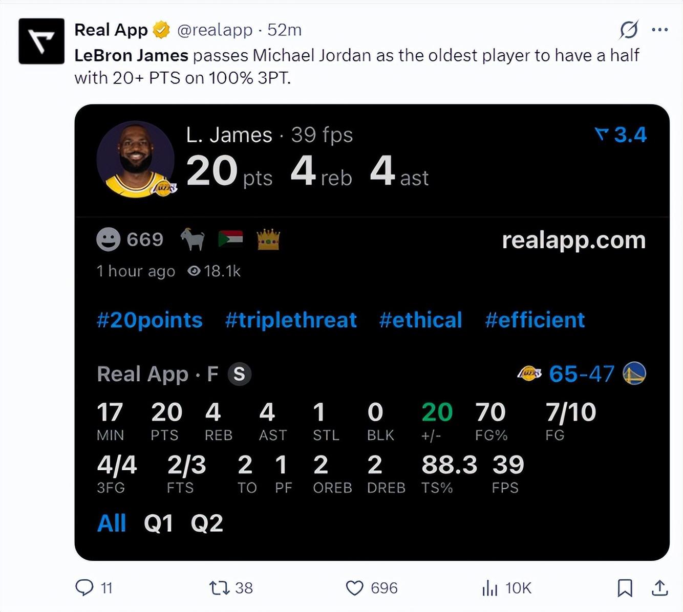 此役詹姆斯創造多項紀錄:1.超越喬丹成爲上半場三分命中率100%且拿20+最年長的球員;