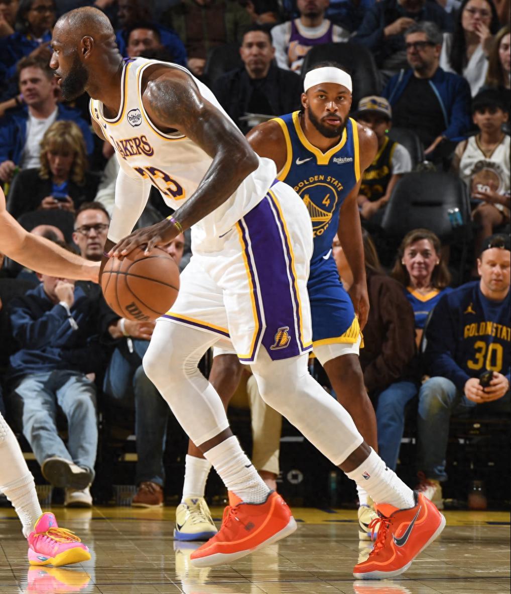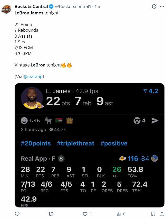 但實際上詹姆斯在湖人116-84領先勇士後就被換下場,全場比賽28分鐘,13中7,三分6中4,罰球5中4,拿到22分9助攻7籃板1搶斷,命中率53.8%,三分命中率80%,真實命中率72.4%,正負值+26。