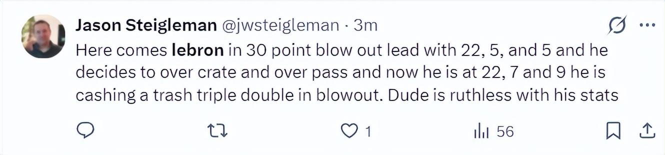 這場比賽美記Jason Steigleman寫道:勒布朗在湖人領先30分時還登場,當時他的數據是22+5+5,他還是決定登場刷數據,他希望在一場大比分領先的情況下刷三雙,這傢伙真是對數據非常癡迷。