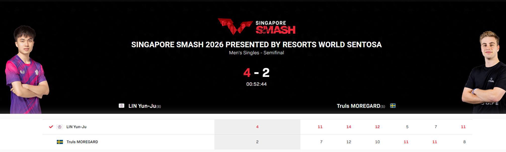 北京時間3月1日,WTT新加坡大滿貫男單半決賽,林昀儒(世界第八)以4-2擊敗莫雷加德(世界第五),六局比分:11-7、14-12、12-10、5-11、7-11、11-8。林昀儒率先晉級決賽,他將等待王楚欽VS小勒布倫的勝者。