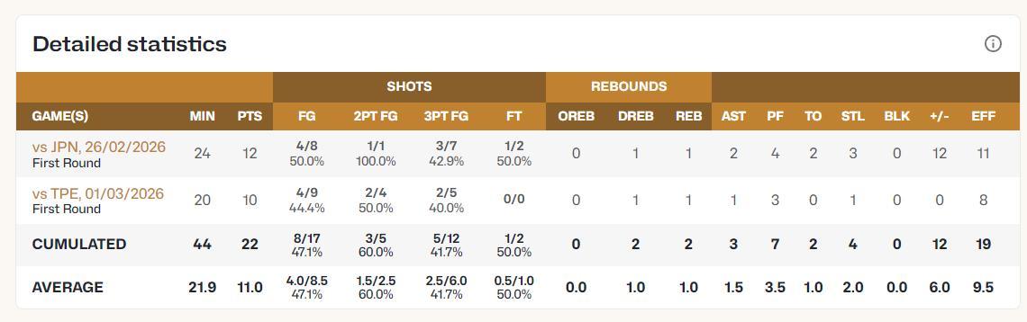 對陣中國臺北的第二節賀希寧的個人表現也非常出色,短短4分13秒,4中3,三分3中2,拿到8分,兩個45度的幹拔三分球太準了。這兩場比賽賀希寧得分都上雙。