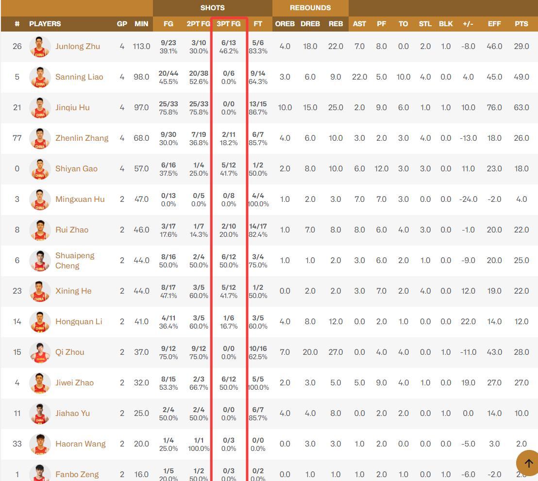 朱儁龍四場球三分13中6,程帥澎兩場三分12中6,高詩巖4場三分12中5,賀希寧兩場12中5,趙繼偉兩場12中6,這些球員都是三分投得非常出色的存在,可賀希寧與趙繼偉兩人不管是產量、命中率都在第一檔。