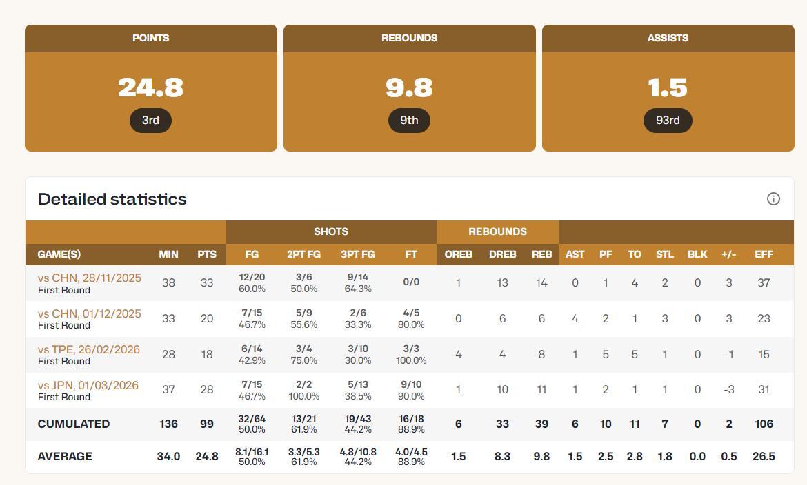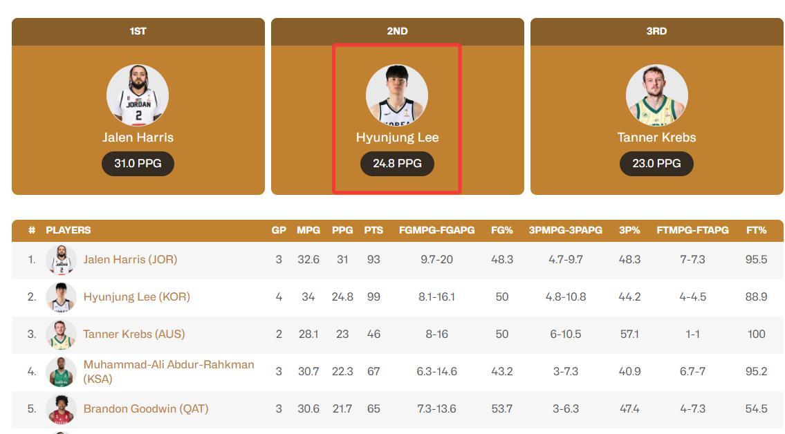 作爲韓國本土球員李賢重場均24.8分排在世預賽亞洲區第二的位置,第一是約旦歸化球員杰倫-哈里斯場均31分,這說明李賢重在世預賽就是歸化選手的存在。