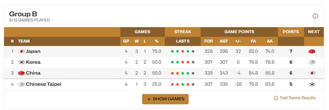 世預賽第二個窗口期,韓國隊72-78惜敗日本隊,這場比賽後韓國隊跟中國隊都是2勝2負,因爲第二個窗口期韓國二連敗,中國二連勝,不過韓國隊還是排在小組第二,中國隊排在小組第三。