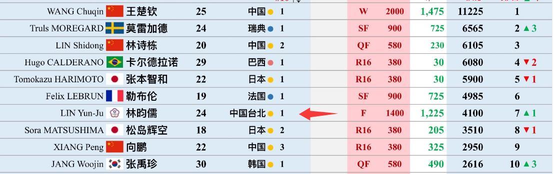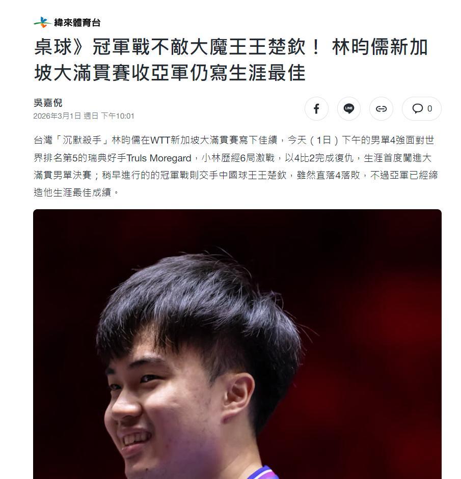 臺媒《緯來體育臺》發文:冠軍戰不敵大魔王王楚欽!林昀儒新加坡大滿貫亞軍收官依舊書寫生涯最佳。
