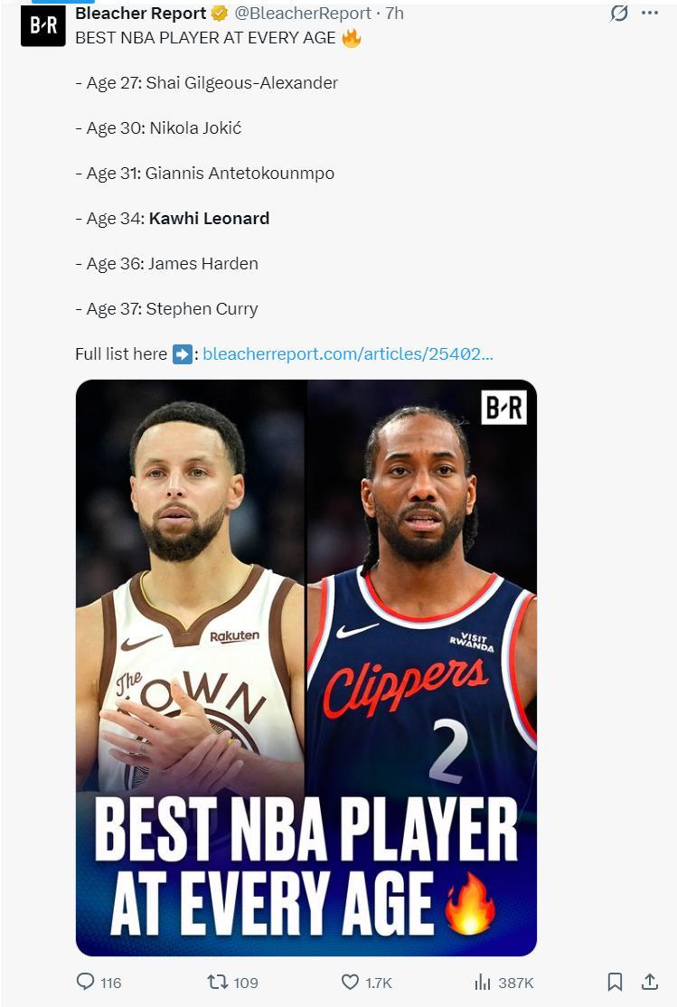 美媒BR也力挺現役最強34歲的球星是倫納德,現役最強37歲的球星是庫裏而非杜蘭特。