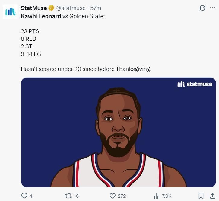 倫納德自感恩節後就沒有下過20+,本賽季的倫納德場均32.6分鐘,拿到27.8分6.3籃板3.7助攻2搶斷0.5蓋帽,命中率49.6%,三分命中率37.8%。