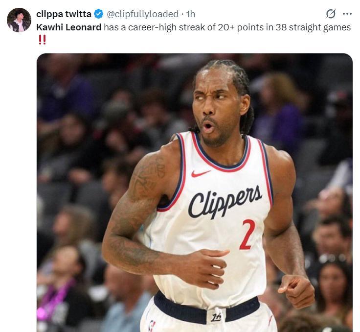 此役倫納德還完成連續38場比賽20+創造職業生涯新高,這也是快船隊史第二長,最長的是74-75賽季的鮑勃-麥卡杜44場,本賽季倫納德就有希望打破這項紀錄。